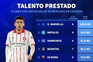 體育資訊2月10日訊 德國轉(zhuǎn)會市場統(tǒng)計了各俱樂部租借加盟球員的身價,并列出榜單,馬賽居首,那不勒斯、漢堡二三位。