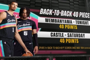 上一場(chǎng)戰(zhàn)勝獨(dú)行俠,卡斯?fàn)柨诚?0分12籃板12助攻。這是馬刺自1984年的格文和邁克·米切爾以來,首次出現(xiàn)連場(chǎng)不同球員砍下40+的情況。