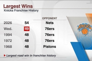 今日 尼克斯大勝76人49分(隊(duì)史客場(chǎng)最大凈勝分)