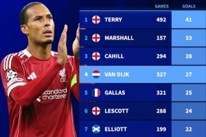 體育資訊2月12日訊 德國轉(zhuǎn)會市場統(tǒng)計了英超歷史上中后衛(wèi)進(jìn)球數(shù)據(jù)排名,約翰·特里41球居首,范戴克27球第四。