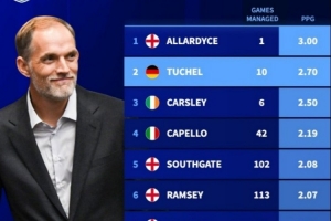 體育資訊2月12日訊 圖赫爾正式與英格蘭隊(duì)續(xù)約至2028年,德轉(zhuǎn)也盤點(diǎn)了英格蘭隊(duì)史場(chǎng)均積分最高主帥榜單,具體如下:
