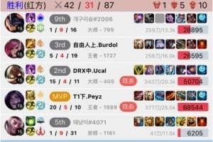 體育資訊2月13日訊 根據(jù)韓服排位統(tǒng)計小程序顯示,Peyz昨日在韓服排位中偶遇GEN上中野,Peyz操刀卡莎直接殺穿GEN上中野帶隊取勝!