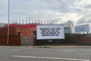 在老特拉福德外,有一個橫幅這樣寫道:移民對這座城市的貢獻遠超那些逃稅的億萬富翁。