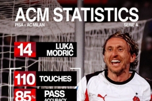體育資訊2月14日訊 意甲第25輪比賽,莫德里奇破門(mén),米蘭客場(chǎng)2-1擊敗比薩,米蘭官方社媒曬出莫德里奇本場(chǎng)比賽的數(shù)據(jù),配文:“大師風(fēng)范?!?/p>