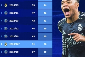 7、25/26賽季皇馬,31場(chǎng)38球(未結(jié)束)
