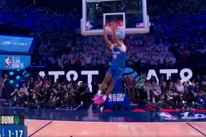 體育資訊02月15日訊 NBA全明星扣籃大賽,預賽第2球前扣籃王杰森·理查德森之子杰斯·理查德森登場,他從三分線外拋球,一次完成拉桿背扣,最終得到45.4分。