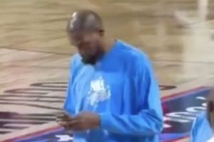 美媒NBA Memes曬出杜蘭特在賽場上看手機(jī)的照片(不一定是在比賽中),美媒吐槽:杜蘭特試圖效仿Shams。