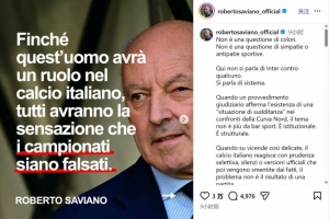 薩維亞諾對馬洛塔的抨擊十分直接,他甚至在 Instagram發(fā)文時(shí)配上了馬洛塔的照片。身為那不勒斯死忠的薩維亞諾特意強(qiáng)調(diào),自己的立場與球隊(duì)無關(guān),他說:“這不是球衣顏色的問題,也不是體育層面的好惡問題。這不是國際米蘭對陣某支球隊(duì)的問題,而是體系的問題。當(dāng)一份司法裁定明確指出,存在某些‘受控局面’時(shí),這件事就不再是酒吧里的閑聊話題,而是上升到了體制與結(jié)構(gòu)性問題。當(dāng)意大利足壇面對如此敏感的事件,卻采取選擇性謹(jǐn)慎、集體沉默,或是推出隨后被事實(shí)戳穿的官方說辭時(shí),問題就不再是一場比賽的結(jié)果?!?/p>
