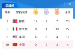 體育資訊02月16日訊 米蘭冬奧會第9個比賽日戰(zhàn)罷,中國隊仍2銀2銅,排在第19。挪威12金7銀7銅高居第一,意大利8金4銀10銅第二,美國5金8銀4銅第三。