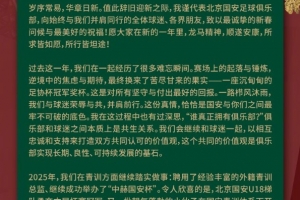 歲序常易,華章日新。值此辭舊迎新之際,我謹代表北京國安足球俱樂部,向始終與我們并肩同行的全體球迷、各界朋友,致以最誠摯的新春問候與最美好的祝福!愿大家在新的一年里,龍馬精神,順遂安康,所求皆如愿,所行皆坦途!