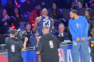NBA記者Grant Mona曬出一段全明星現(xiàn)場花絮,美國星條隊(duì)球星詹姆斯在賽前完成個(gè)人經(jīng)典的拋撒鎂粉儀式,因傷缺陣的隊(duì)友庫里在一旁探頭探腦近距離觀察,還一度想要進(jìn)行模仿。隨后,詹姆斯與庫里擊掌致意。