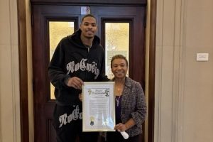 Marc J. Spears寫道:“邁阿密熱火前鋒凱沙·約翰遜在周日贏下NBA扣籃大賽后,今日在奧克蘭市政廳獲頒來自奧克蘭市長Barbara Lee及市議會議員的嘉獎令?!?/p>