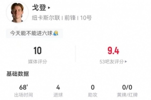 體育資訊2月19日訊 紐卡在本輪歐冠附加賽首回合大比分領(lǐng)先卡拉巴赫,戈登本場數(shù)據(jù)如下: