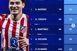 體育資訊2月19日訊 在歐冠附加賽馬競(jìng)3-3戰(zhàn)平布魯日的比賽中,阿爾瓦雷斯破門(mén)。以下為阿根廷球員在歐冠歷史進(jìn)球榜: