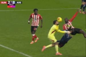 本賽季英超第11輪,阿森納客場2-2遭桑德蘭絕平。補時階段,桑德蘭高球打進禁區(qū),拉亞出擊與加布相撞,布羅比趁亂將球打進。