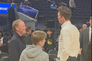 賽前,目前賦閑在家的冠軍教練布登霍爾澤出現(xiàn)在場邊,和勇士總經(jīng)理鄧利維交流。