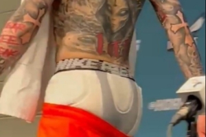 賽后采訪,遭遇車禍的拉梅洛·鮑爾明顯情緒不高,他不僅光個(gè)膀子,而且球褲只穿了一半,露出了里面的打底褲,在采訪中途,他起身離開。