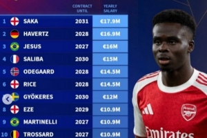 體育資訊2月20日訊 薩卡正式與阿森納完成續(xù)約,德轉(zhuǎn)也盤點了阿森納隊內(nèi)年薪榜,其中薩卡位居第一,具體如下(合同期限,年薪):