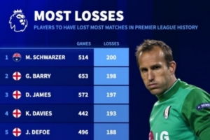 體育資訊2月21日訊 德國轉會市場統(tǒng)計了球員在英超的輸球場次,并列出英超歷史輸球場次榜,施瓦澤200負最多,巴里198負第二。