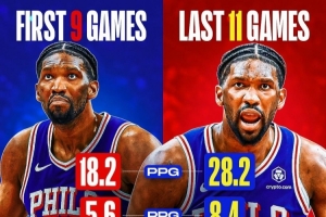恩比德,賽季至今共計(jì)出場(chǎng)20場(chǎng),場(chǎng)均可以拿到23.7分7.1籃板3.3助攻,投籃命中率47.2%,真實(shí)命中率57.8%。