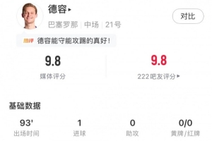 本場比賽荷蘭中場弗蘭基?德容為巴薩首發(fā)踢滿全場,全場比賽他不僅完成破門,還成為球隊的節(jié)拍器,傳球多達116腳的同時,傳球成功率高達97%。最終他獲得了9.8分的全場最高評分。