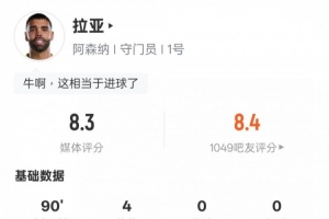 體育資訊2月23日訊 英超第27輪焦點(diǎn)戰(zhàn),阿森納4-1戰(zhàn)勝熱刺。拉亞首發(fā)出戰(zhàn),表現(xiàn)出色,貢獻(xiàn)全場(chǎng)最多的4次撲救,評(píng)分8.3。