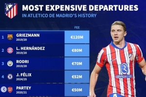 體育資訊1月15日訊 馬競已經(jīng)官宣中場加拉格爾轉(zhuǎn)會熱刺,《轉(zhuǎn)會市場》也統(tǒng)計了馬競隊史最貴賣人情況,格列茲曼仍居首。