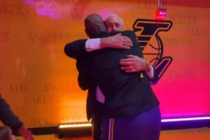 熱火官推曬出賽前詹姆斯和萊利擁抱的瞬間,兩人曾在熱火共事四年。