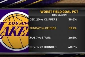 湖人今天慘敗凱爾特人,全隊命中率僅39.1%,賽季倒數(shù)第二低。