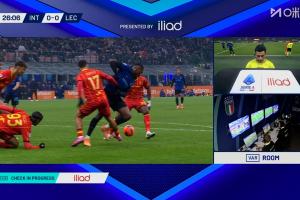 體育資訊01月15日訊 國米vs萊切第25分鐘,博尼禁區(qū)內(nèi)倒地,裁判給了點球,但到場邊看VAR后,裁判判罰不是點球!
