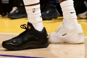 本場比賽詹姆斯上腳黑白鴛鴦的23代“Equality”配色球鞋亮相賽場。