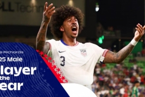 體育資訊1月15日訊 美國足協(xié)官方宣布,25歲的水晶宮中衛(wèi)理查茲當(dāng)選為2025年美國足球先生。
