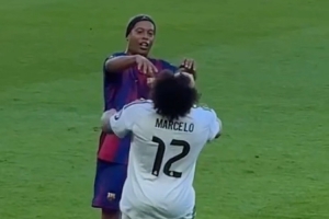 巴薩傳奇隊(duì)vs皇馬傳奇隊(duì)的表演賽在美國洛杉磯進(jìn)行,比賽中小羅開玩笑推搡馬塞洛,后者順勢(shì)倒地,復(fù)制了昔日國家德比的“火藥味”。