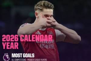 體育資訊2月23日訊 在本輪英超阿森納4-1大勝熱刺的比賽中,約克雷斯梅開二度。以下為英超球員在2026年各項賽事進球榜: