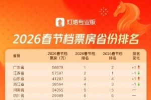 體育資訊2月24日訊?據(jù)燈塔專業(yè)版數(shù)據(jù),廣東省2026年春節(jié)檔票房反超過去蟬聯(lián)5年的江蘇省,繼2019年后,再度登頂春節(jié)檔省份票房榜!
