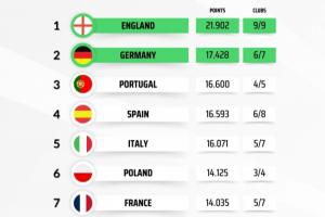 目前個聯(lián)賽歐戰(zhàn)積分方面,英超早已鎖定前二,新賽季將有一個額外的歐冠名額,目前德甲積分暫時排名第二。