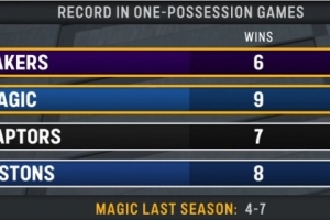 湖人主場(chǎng)迎戰(zhàn)魔術(shù),轉(zhuǎn)播方給出一項(xiàng)統(tǒng)計(jì),本賽季一回合定勝負(fù)(分差3分以內(nèi))的比賽,湖人6勝0負(fù)排名第一,魔術(shù)9勝3負(fù)排名第二。