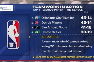 40-20奪冠定律:一支球隊(duì)必須在輸?shù)?0場(chǎng)比賽前贏得40場(chǎng)勝利,才有可能贏得當(dāng)賽季總冠軍。