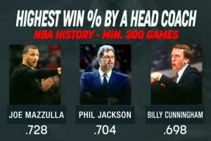 在至少執(zhí)教300場比賽的主教練中,馬祖拉勝率72.8%歷史第一!菲爾·杰克遜70.4%第二,比利·坎寧安69.8%第三。