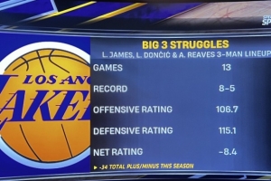 湖人客場挑戰(zhàn)太陽,賽前轉(zhuǎn)播方給出本賽季至今東契奇、詹姆斯和里夫斯在場時的數(shù)據(jù):