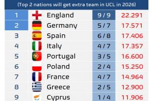 目前歐戰(zhàn)積分中,英格蘭22.291分遙遙領(lǐng)先,基本確定拿到新賽季5個歐冠參賽名額,德國、西班牙、意大利分列2-4位,分差不到0.3。