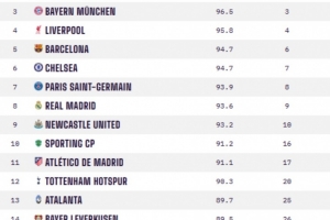 體育資訊2月27日訊 本賽季歐冠淘汰賽抽簽結(jié)束,以下為數(shù)據(jù)網(wǎng)站OPTA對(duì)歐冠16強(qiáng)做的實(shí)力排名(括號(hào)內(nèi)為全球排名)。