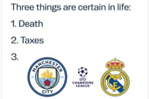 推文配文 “瞧瞧我們。誰(shuí)能想到呢”,并附上一張玩梗圖,將西方經(jīng)典諺語(yǔ)“人生只有死亡和稅收是確定無(wú)疑的”進(jìn)行改編,新增了第三條“曼城在歐冠對(duì)陣皇馬”。