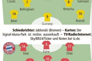 體育資訊2月28日訊 本輪德甲焦點(diǎn)戰(zhàn),多特蒙德將在伊杜納信號公園球場迎戰(zhàn)拜仁慕尼黑?!短咔蛘摺芬差A(yù)測了雙方首發(fā)陣容。