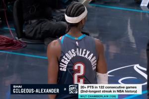 這是亞歷山大連續(xù)122場(chǎng)砍下20+,距離NBA歷史紀(jì)錄的張伯倫126場(chǎng)僅差4場(chǎng)。