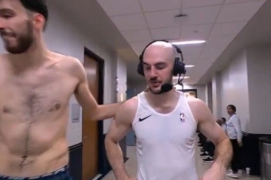 雖瘦但能搶板!卡魯索賽后接受采訪時(shí)切特經(jīng)過(guò) 半裸排骨吸引眼球