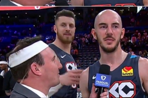 賽后雷霆球員卡魯索在場邊接受隊記Nick Gallo的采訪。哈爾滕施泰因過來整蠱隊記,將卡魯索的頭戴摘下并套在Nick Gallo頭上,發(fā)帶秒變“繃帶”。
