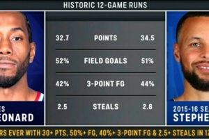 史上僅有的兩位 在連續(xù)12場比賽中場均至少30分2.5斷 命中率50%&三分命中率40%球員