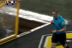 比賽第70分鐘,此時狼隊1-0領(lǐng)先。而主裁判鮑森突然中斷了比賽并離場,兩分鐘后,他一邊整理著服裝和設(shè)備一邊回到場內(nèi)。