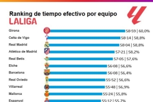 體育資訊3月3日訊 Opta統(tǒng)計了本賽季西甲各隊聯賽場均比賽凈時間,并列出榜單,赫羅納居首,皇馬第三、巴薩第七。